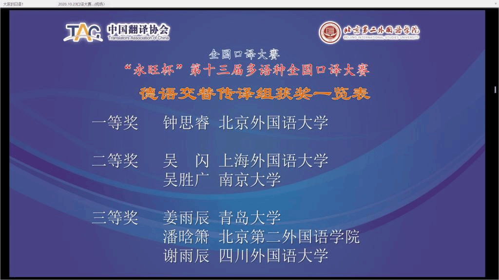 开云kaiyun登录入口2018级研究生钟思睿同学10月24日在 “永旺杯”第十三届多语种全国口译大赛中荣获德语交传组冠军、一等奖。