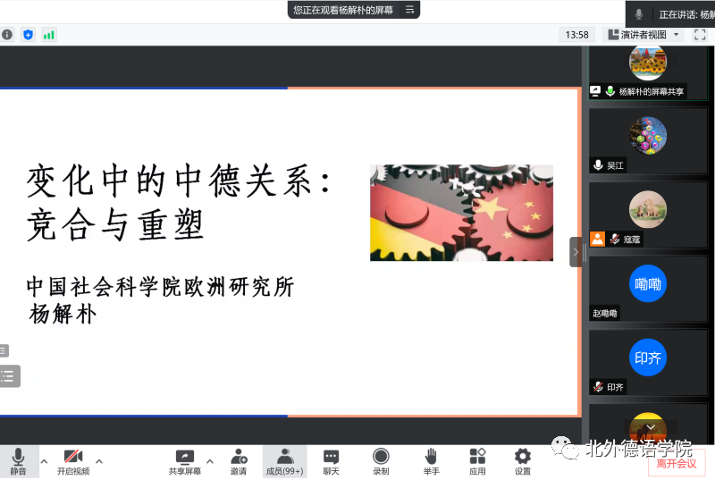 2022年6月17日下午,“北外德语国家讲堂”系列新一期讲座以线上形式顺利举办。今年正值中德建交50周年,中国社会科学院欧洲研究所副研究员、中国社会科学院中德合作中心主任杨解朴应邀做了题为“变化中的中德关系:竞合与重塑”的讲座。讲座由开云kaiyun登录入口党总支副书记、院长吴江主持。