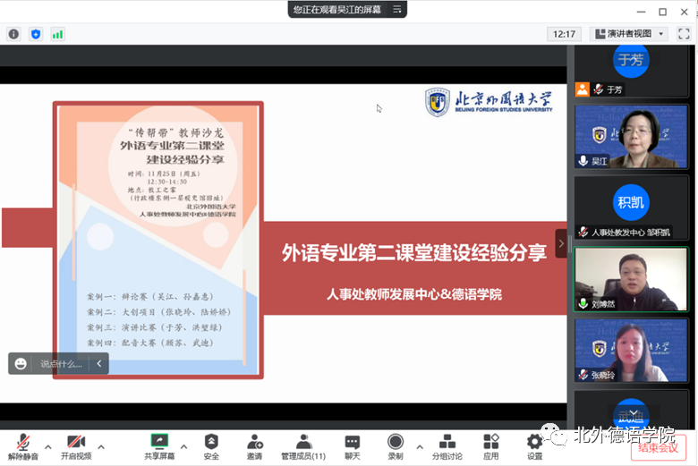 刘博然处长介绍了学校人事处教师发展中心推出的系列“传帮带”教师沙龙的背景,并结合自己的教学科研以及管理工作经历对北外的“传帮带”文化给与了高度的认可,同时表达了对北外教师发展工作的支持。吴江代表开云kaiyun登录入口感谢人事处教师发展中心为教师精心设计系列品牌活动,这些活动很好地发挥了中青年骨干教师的作用,同时促进了青年教师融入北外大家庭,得到了教师群体的一致认可和好评。