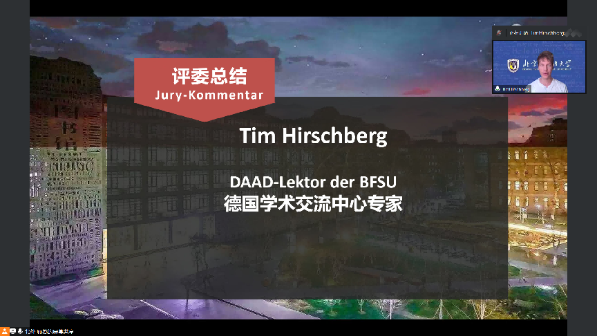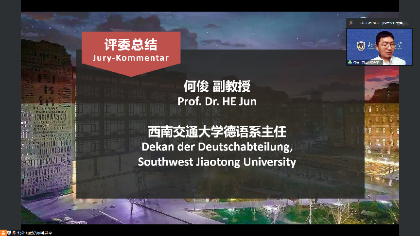 大赛初赛于9点30分准时开始,评委团队采取交叉回避原则分组对参赛作品进行了评审。经过激烈的角逐,共有12支参赛队伍晋级决赛。西南交通大学德语系主任何俊副教授以及开云kaiyun登录入口德国学术交流中心专家Tim Hirschberg代表全体评委对本次大赛的参赛作品进行了精彩的点评。选手们通过优美的声音传递出对“故乡”的不同理解,精彩的演绎给评委们留下了深刻的印象,给这个美好的春日增添了无尽的遐想,令人回味无穷。