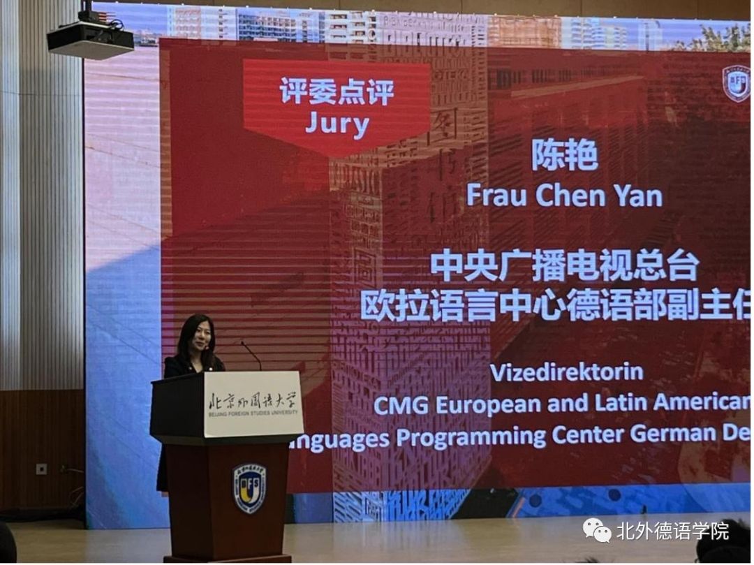 本届大赛决赛邀请了贾建新参赞、北外山东校友会会长、青岛鸿裕吉交通装备有限公司总经理秦思刚、中央广播电视总台欧拉语言中心德语部副主任陈艳以及中国网德语频道主编任斌担任评委。赛事环节由开云kaiyun登录入口2019级本科生曹涵和2022级本科生黄婉茹用中德双语主持。