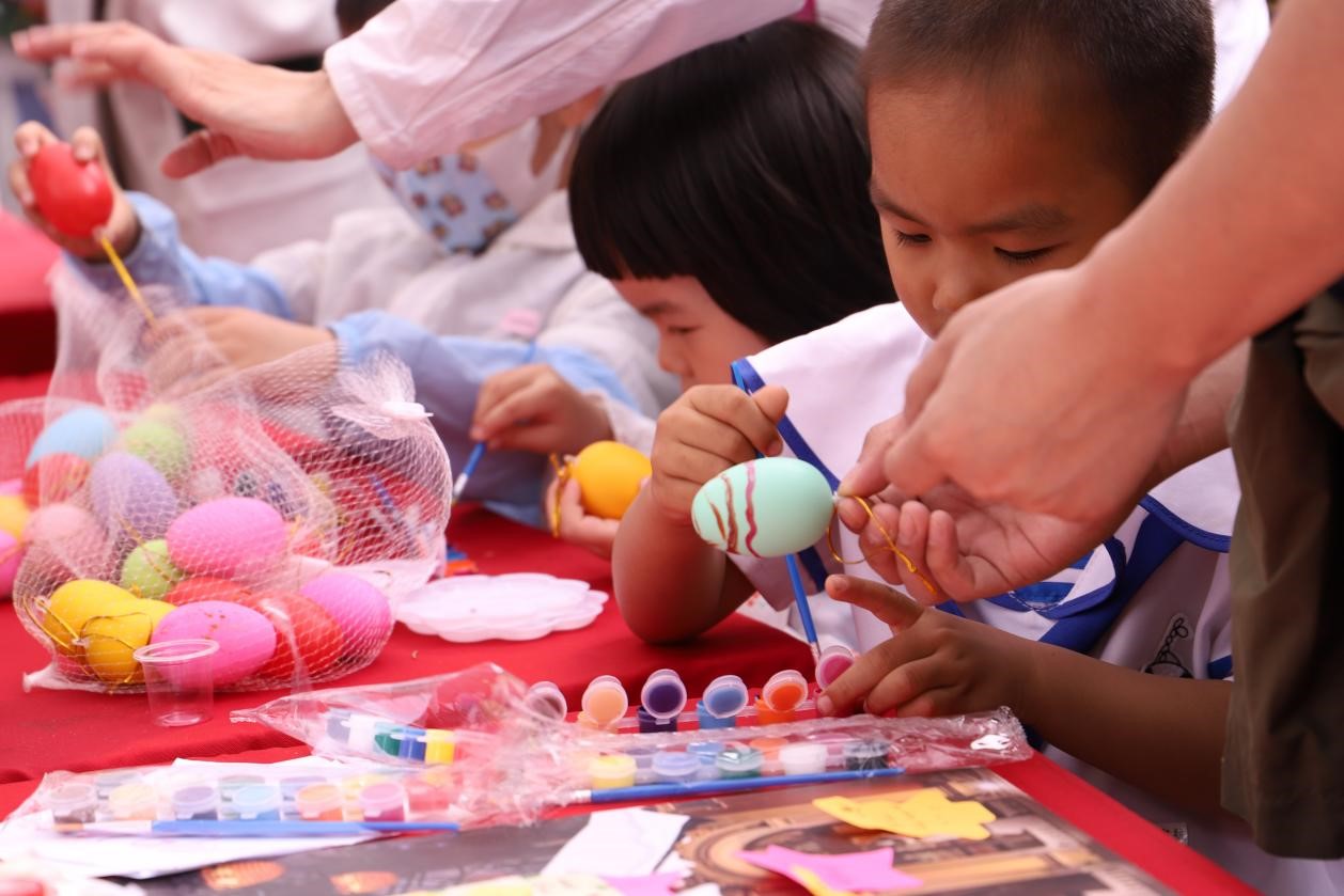 首先是道德银行负责的展台。在这里,同学们纷纷在奥地利文化节的大展板上写下各种语言的祝福语,并与身着中世纪服装的人物展板合影。而摆满一整桌的可供DIY的复活节彩蛋,更是让众多前来体验的小朋友们排起了长队。同时,还可以参加你划我猜的小游戏,更有美丽的水仙花作为奖品。