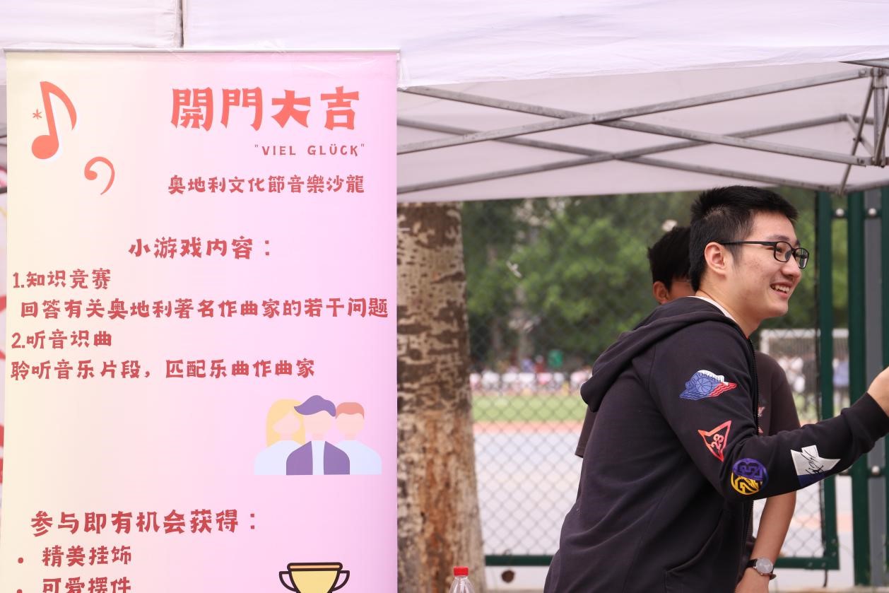 体育部负责的展台以奥地利音乐的有关知识为主题,同学们在欣赏知名作曲家的音乐的同时,还可以进行轻松有趣的闯关答题。有些精通音乐的同学,不费吹灰之力就将钢琴小摆件、音乐家帆布包等小礼物收入囊中。