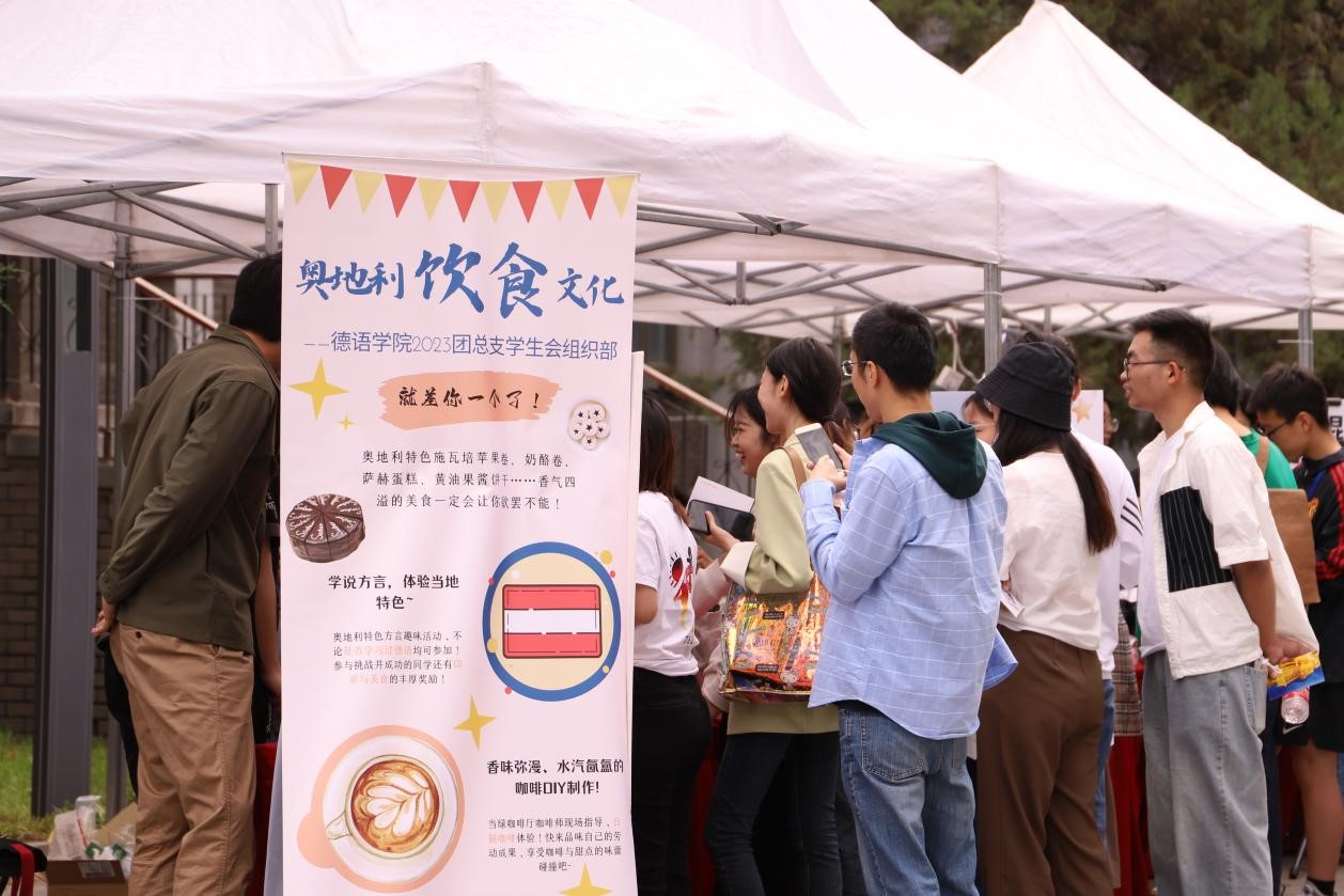 研究生会办公室负责的展台,这里展示了奥地利独特的饮品文化,同学们可以通过答题获得饮品。奥地利红酒、奥地利胡贝尔、奥地利版红牛饮料、维也纳咖啡……多种多样的饮品让人眼花缭乱,在答题的同时更是收获了知识和味觉的双重体验。