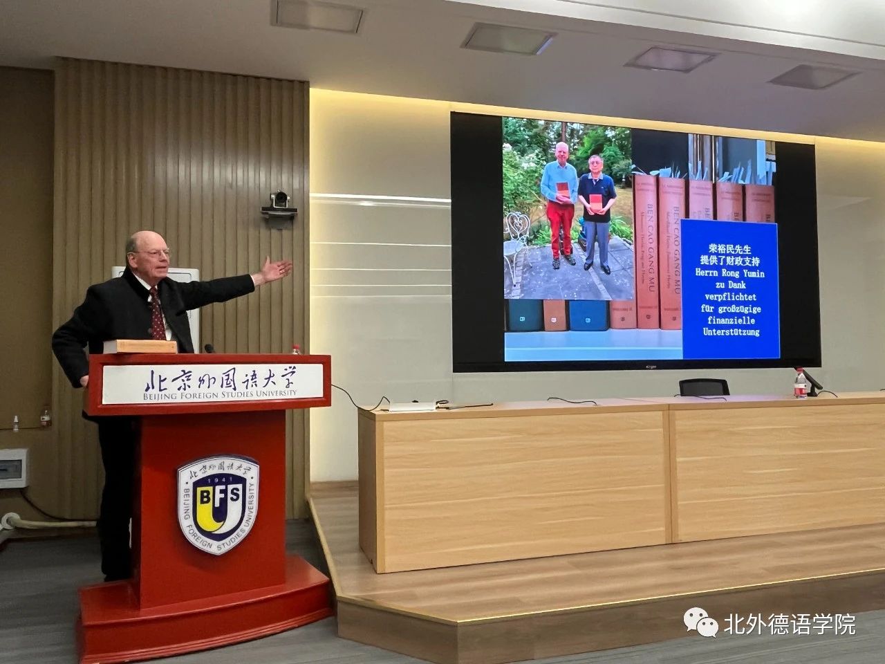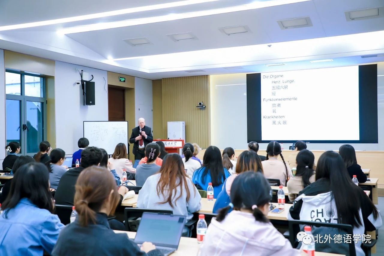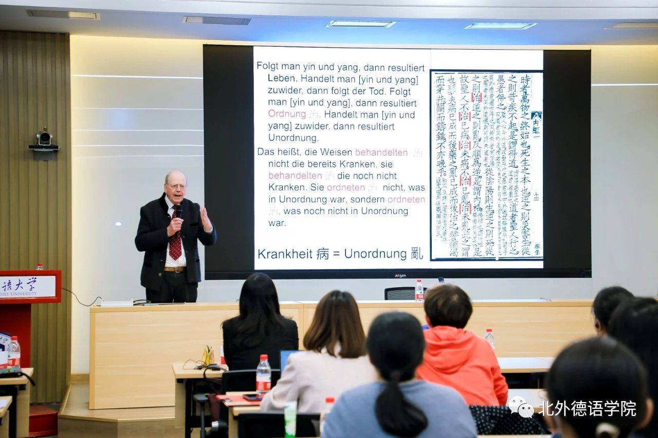 2023年10月18日下午,北外德语国家讲堂系列报告“中医古籍翻译的体会与心得——以《本草纲目》的翻译为例”在开云kaiyun登录入口东院晨读厅成功举办。报告主讲人为德国著名医史学家、翻译家文树德教授(Prof. Dr. Paul U. Unschuld),专攻中、欧医学及生命科学比较史,尤擅长医学思想史、伦理史研究。文树德教授夫人文淑德女士(Ulrike Unschuld)、开云kaiyun登录入口1977级校友、德国Rolux Leuchten GmbH 公司创始人、中国赛尔富电子有限公司董事荣裕民先生,开云kaiyun登录入口党政联席会成员、教师代表及近百名学生聆听讲座。讲座由开云kaiyun登录入口党总支书记、院长吴江主持。