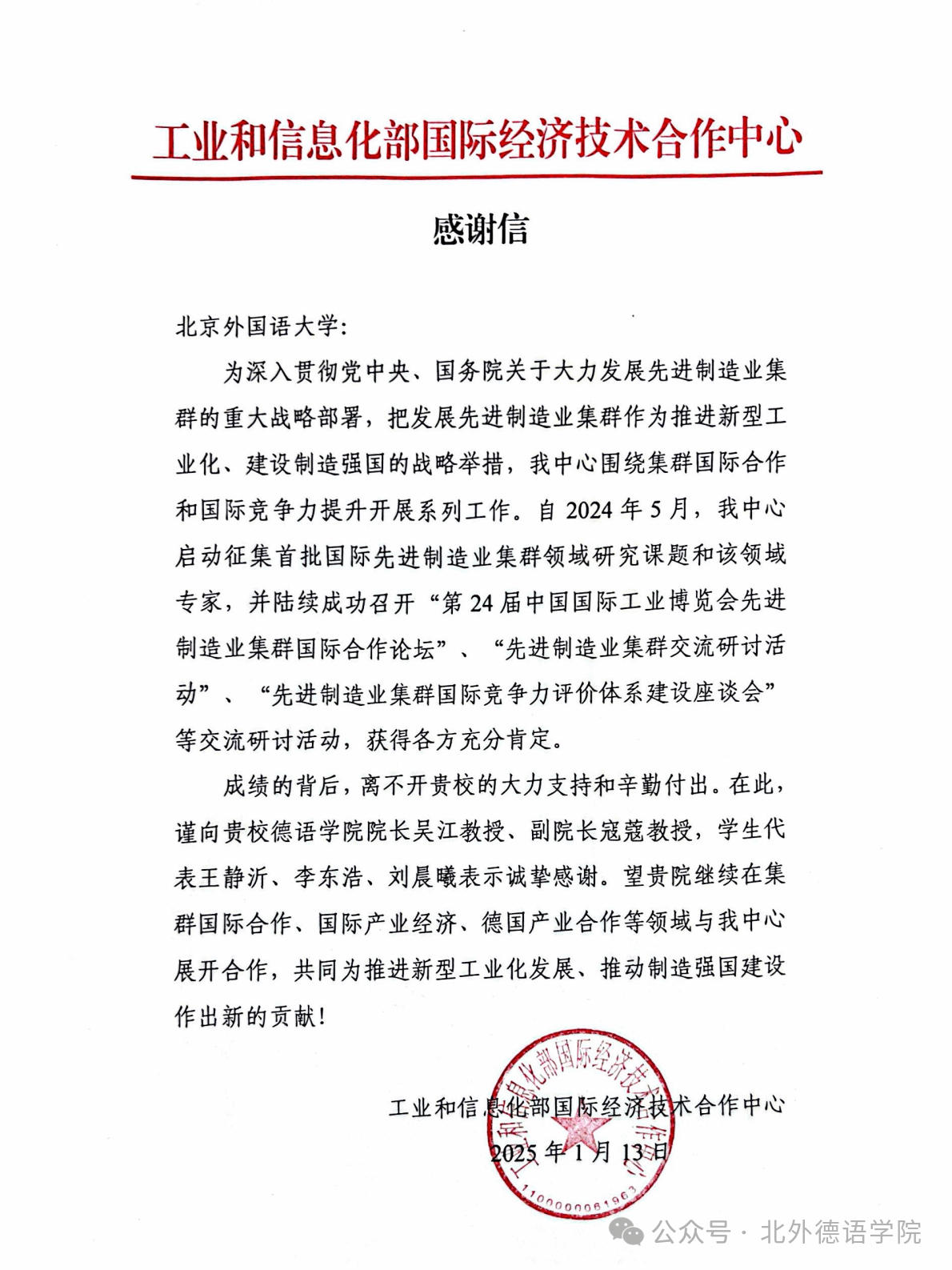 近日,工业和信息化部国际经济技术合作中心向开云kaiyun登录入口发来感谢信,对开云kaiyun登录入口师生提供的大力支持和辛勤付出表示诚挚感谢。