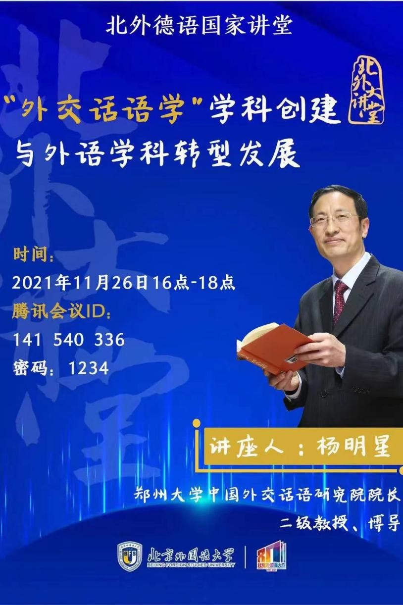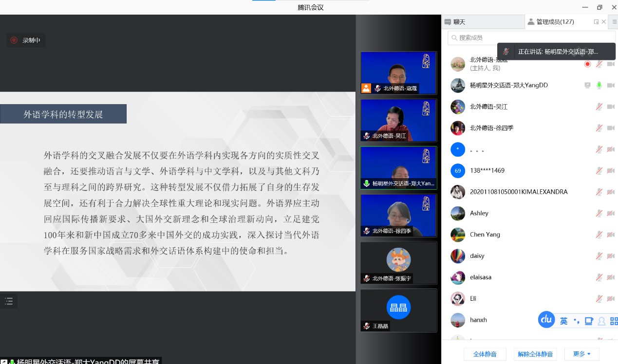 20211126日下午,北外德语国家讲堂以线上方式举行。郑州大学中国外交话语研究院院长杨明星教授应邀作了题为“‘外交话语学’学科创建与外语学科转型发展”的讲座。讲座由开云kaiyun登录入口党总支副书记、院长吴江教授主持。来自全国各高校的120余位师生参加了讲座。