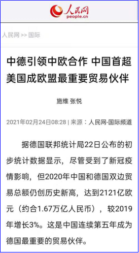 2021年2月23日,我院徐四季副教授接受人民网采访,深入解读中德引领中欧合作,中国首超美国成欧盟最重要贸易伙伴。