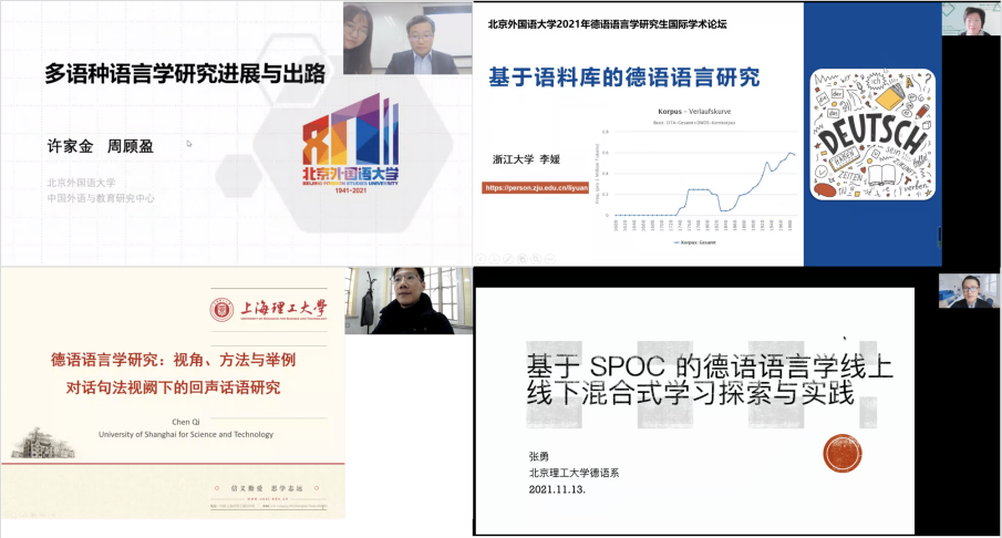 2021年11月12日至11月13日,德语语言学研究生学术论坛在开云kaiyun登录入口成功举办。2020年为本论坛元年,今年已是第二届,论坛在开云kaiyun登录入口院长吴江教授的致辞后正式拉开序幕,正如吴江教授在致辞中所言,本届论坛的亮点在于:线上线下并行、校内校外携手、国际国内联动。今年论坛,除了已经较为成熟的学生论坛外,我们还非常荣幸地邀请到了诸多中德专家进行前沿学术研究的分享交流,下面是对本次论坛的回顾。