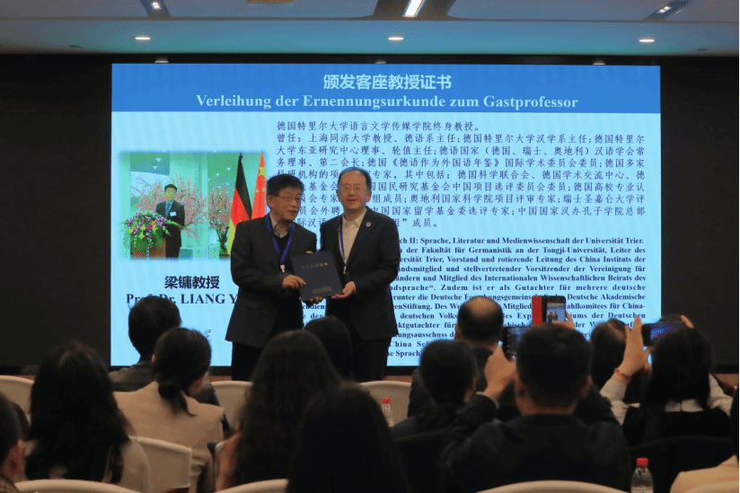 随后举行客座教授聘任仪式。德国特里尔大学语言文学传媒学院终身教授,原特里尔大学汉学系主任、德语国家汉语学会第二会长、同济大学教授梁镛受聘担任开云kaiyun登录入口客座教授,贾文键校长为其颁发客座教授聘书。