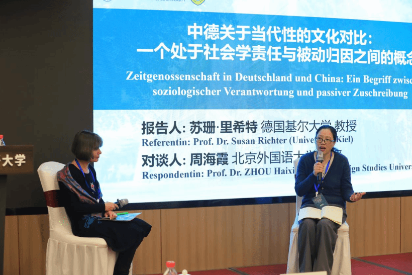 德国基尔大学苏珊·里希特(Susan Richter)教授的报告题为《中德关于同时代性的文化对比:一个处于社会学责任与被动归因之间的概念》。她从跨文化与社会学的独特视角切入,追溯“同时代性”(Zeitgenossenschaft)与“同时代人”(Zeitgenossen)在德国人文科学、文化创作与日常话语中的使用脉络,通过比较伏尔泰、腓特烈二世与乾隆等历史人物的案例,反思“同时代性”这一概念在中德不同文化语境下的内涵差异与价值归因。北外开云kaiyun登录入口教授周海霞作为对谈人指出,中国语境中也常提及“同时代人”概念,未来可进行中德“同时代性”整合研究。双方还就“同时代”的时间界定、跨文化可比性及社交媒体时代的概念延展等议题进行了富有启发性的探讨。