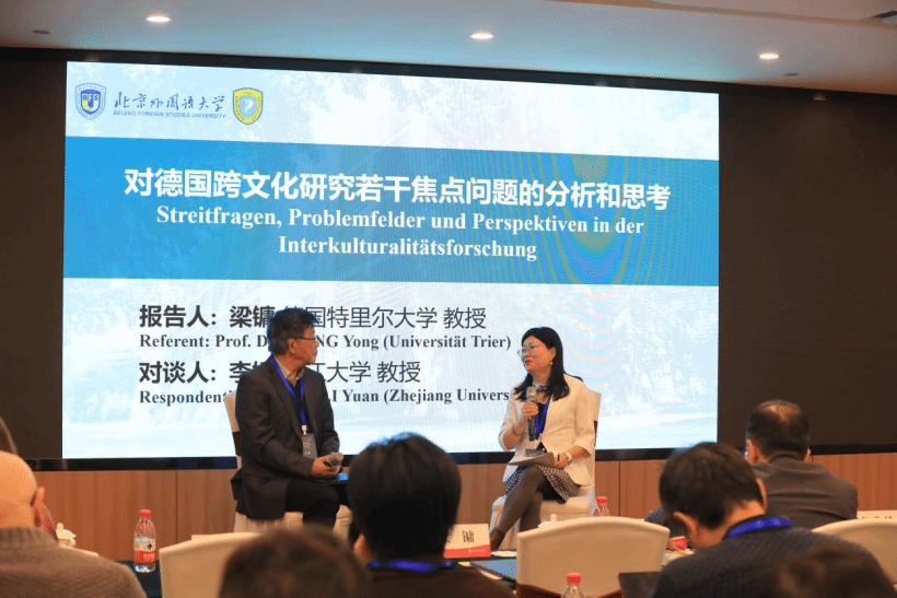 德国特里尔大学教授梁镛应邀作题为《对德国跨文化研究若干焦点问题的分析和思考》的报告。他指出,对文化同质化与本质化倾向需保持警惕,而所谓“二元对立”并非不可调和的冲突。此外,以德国媒体中的“中国形象”研究为例,他强调学界不应止步于对现象的描述,而应进一步思考如何在全球话语竞争中提升中国的形象建构能力。报告结束后,浙江大学外国语学院亚欧系主任、德国文化研究所所长、教授李媛作为对谈人,与梁镛教授就跨文化理论与实践的研究方法、批判性思维的培养以及跨文化性概念的演变展开深入对话。两位教授还探讨了数字化、人工智能对跨文化研究范式的影响,指出在语言与技术不断革新的时代,外语学科应在算法世界中持续传递人文的智慧。