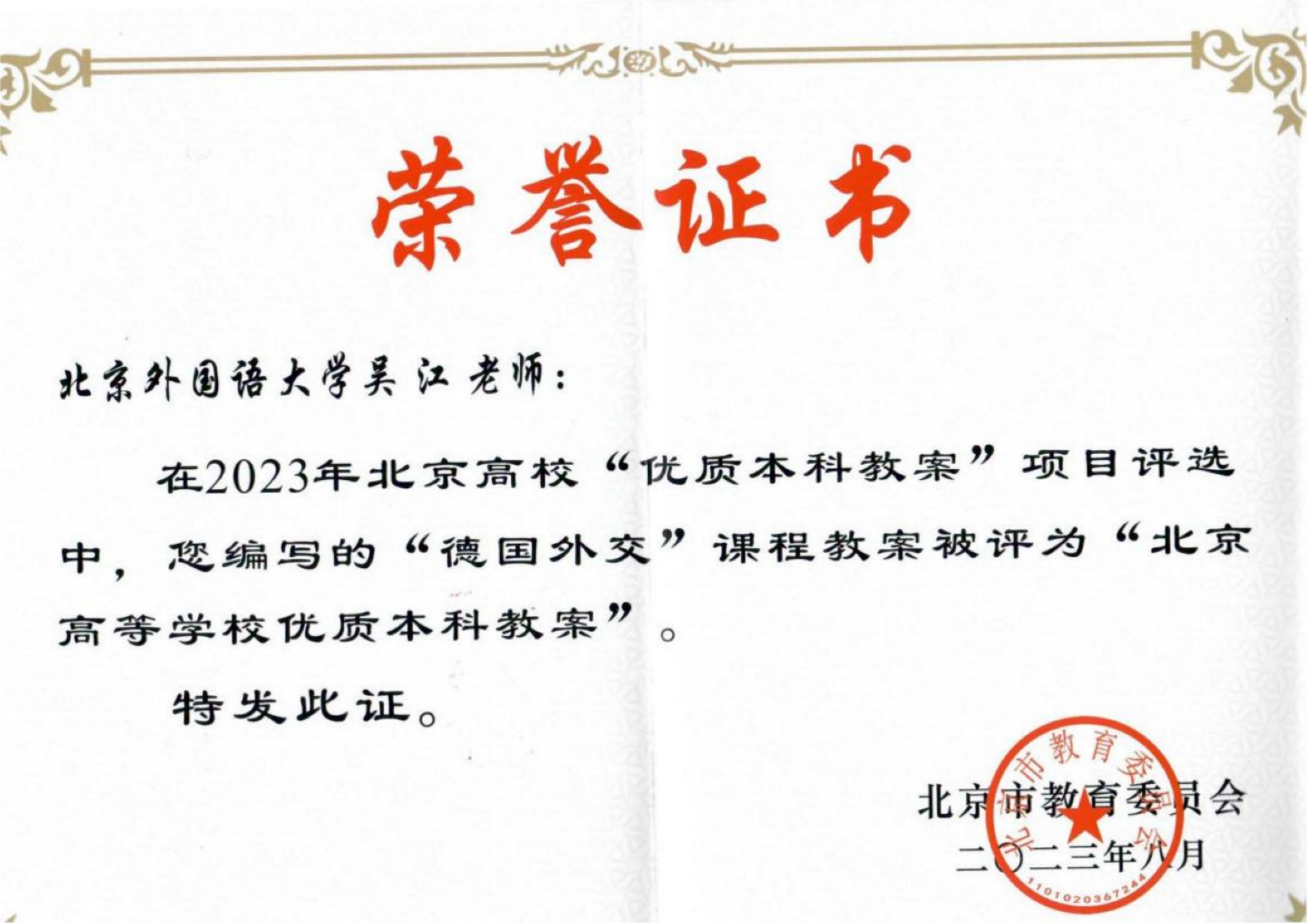 日前,北京市教育委员会公布了2023年度北京高校优质本科教案评选结果。开云kaiyun登录入口“德国外交”课程教案获评“北京高等学校优质本科教案”。