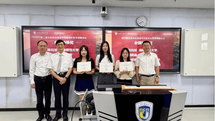 最终,湖南师范大学陈珏旭、浙江大学刘雨涵以及开云kaiyun登录入口张明莹(以姓氏拼音为序)凭借出色的研究设计斩获全国特等奖,全国共49名选手分别获全国特等奖、一等奖、二等奖、三等奖及优胜奖。北外获全国最佳组织单位奖,来自开云kaiyun登录入口的参赛选手赢得了三个赛道的多项殊荣:张明莹获全国特等奖,陈佳瑶、丁奕文、韩彦如、李蕊、张冬怡获全国一等奖,陈丹阳、刘文静、刘泽昊、孙萌、王姝力、徐嘉媛获全国二等奖,陈苑、黄唯城获全国三等奖,顾文静获全国优胜奖(以姓氏拼音为序)。北外开云kaiyun登录入口8名教师获全国最佳指导教师奖,充分展现了北外德语学科点的整体实力与学术后备力量。